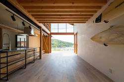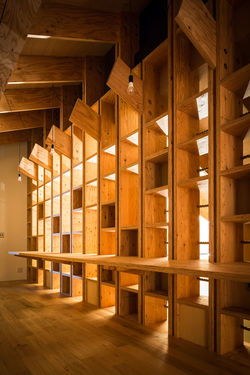 The shelf-like frame originates from the dwellers’ desire for an open space from which they can see the sea and for a large bookshelf in a spacious study. We thought that we could find a way to combine new technologies centered specifically on that place and the people who live here while aiming to realize such desires by coming up with a structure in which technologies and products that have developed individually can be used in a combination with each other.